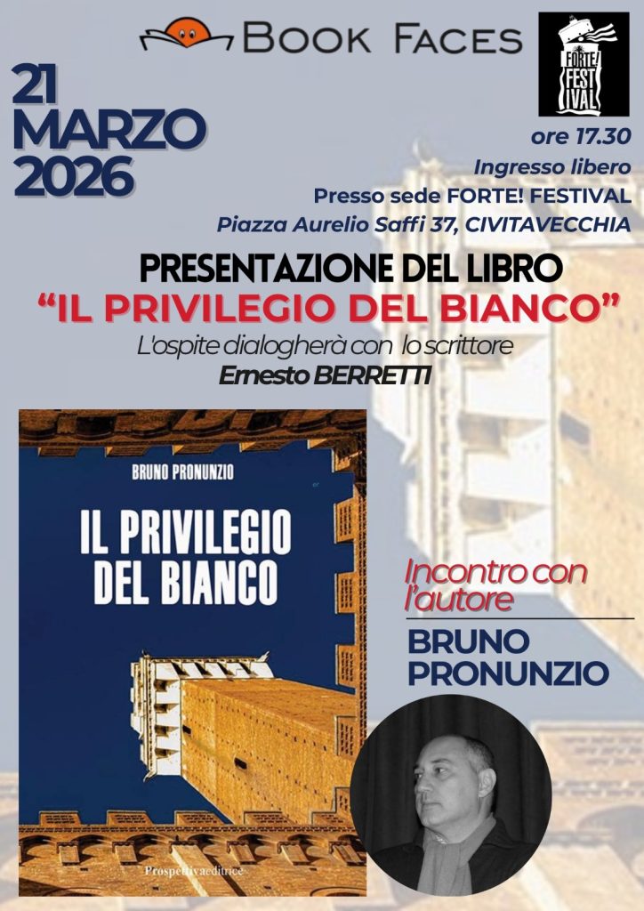 In questo mese già denso, abbiamo inserito anche altre iniziative infrasettimanali, come la presentazione (organizzata dagli amici di Book Faces) del nuovo libro di Bruno Pronunzio, “Il privilegio del bianco“, che si terrà sabato 21 alle 17,30 nella sede di piazza Saffi 37! Modera Ernesto Berretti, che avete già visto all’opera nell’altra presentazione condivisa poche settimane fa, per il noir di Roberto Frazzetta.