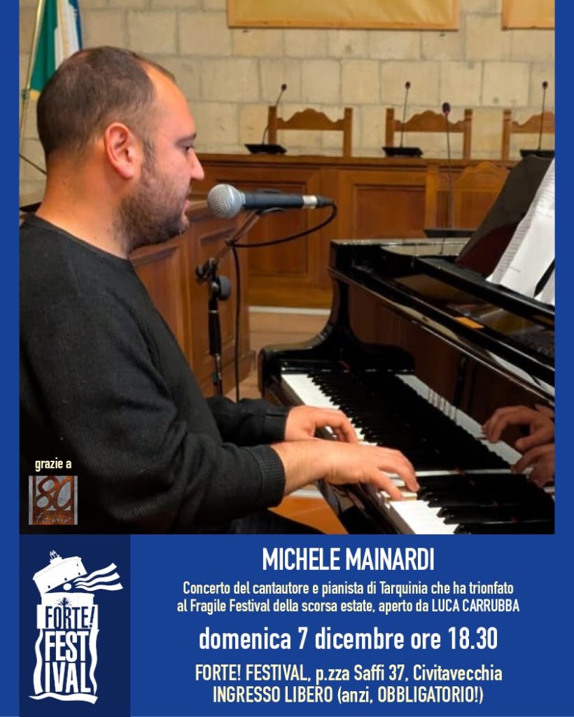 Dopo Roberto Sarno e il Cecilia Baliva Trio, domenica 7 dicembre sarà il turno di Michele Mainardi, il vincitore dei due “contest” che abbiamo supportato quest’estate con la Casa delle Arti e il Teatro di Paglia. Classe 1989, nato a Tarquinia, Michele Mainardi intraprende gli studi musicali all’ età di 12 anni pur essendo appassionato delle “sette note” fin da piccolo. Innamorato soprattutto del cantautorato italiano, nel 2014 pubblica il suo primo album dal titolo SENZA CONVENZIONI, i cui brani sono disponibili in tutte le piattaforme digitali. Nel 2017 consegue il Diploma Accademico di 2° livello in Pianoforte presso il Conservatorio di Roma “Santa Cecilia”, intraprendendo a partire dall’ anno successivo la professione di docente di musica nella scuola secondaria di primo grado. Compone musica e testi fin dall’ adolescenza, maturando nel corso del tempo un repertorio di oltre 100 tra canzoni e brani strumentali. Nel concerto di domenica, proporrà il suo repertorio, in un recital piano e voce che sarà aperto da un altro grande amico di FORTE! Festival, il bravissimo cantautore Luca Carrubba, di cui vi consigliamo di recuperare la stupenda web session disponibile nel nostro canale YouTube.