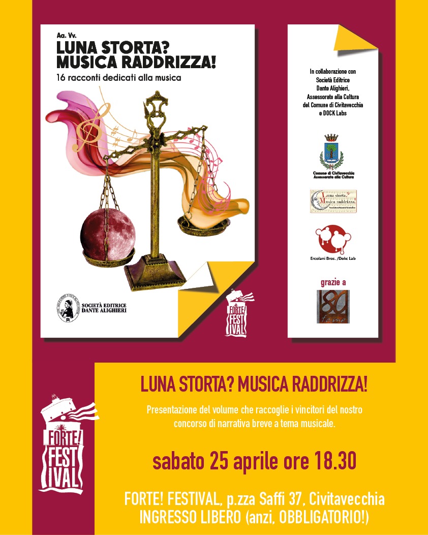 E quindi, nel libro che presenteremo sabato 25 aprile alle 18,30 nella sede di FORTE! Festival (piazza Saffi 37, Civitavecchia), in un’altra iniziativa adeguatamente supportata da esibizioni dei nostri musicisti (e brindisi!!!), troverete tutti i 16 racconti finalisti e altre sorprese impaginati dalla nostra Roberta Barletta, dentro una copertina curata da Massimiliano Ercolani (DOKC Labs): vi aspettiamo numerosi, per farvi ammirare il volume realizzato dalla Società Editrice Dante Alighieri… ma anche per parlare del festival che arriva a breve, e per annunciarvi l’avvio del nuovo concorso che partirà nei prossimi mesi!