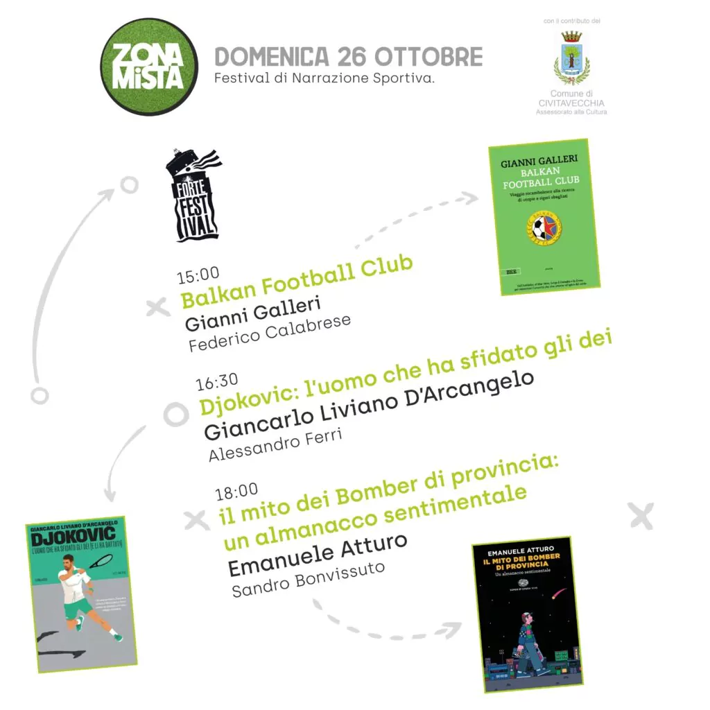 Zona Mista farà tappa nella nostra sede di piazza Saffi 37 (Civitavecchia) domenica 26 ottobre dalle 15: le presentazioni in scaletta, sempre a ingresso libero, saranno dedicate ai libri di Gianni Galleri (Balkan Football Club), Giancarlo Liviano D’Arcangelo (Djokovic: l’uomo che ha sfidato gli dei) ed Emanuele Atturo (Il mito dei bomber di provincia: un almanacco sentimentale), e visto che giochiamo in casa, le intervalleremo con degli spazi musicali… non mancate!