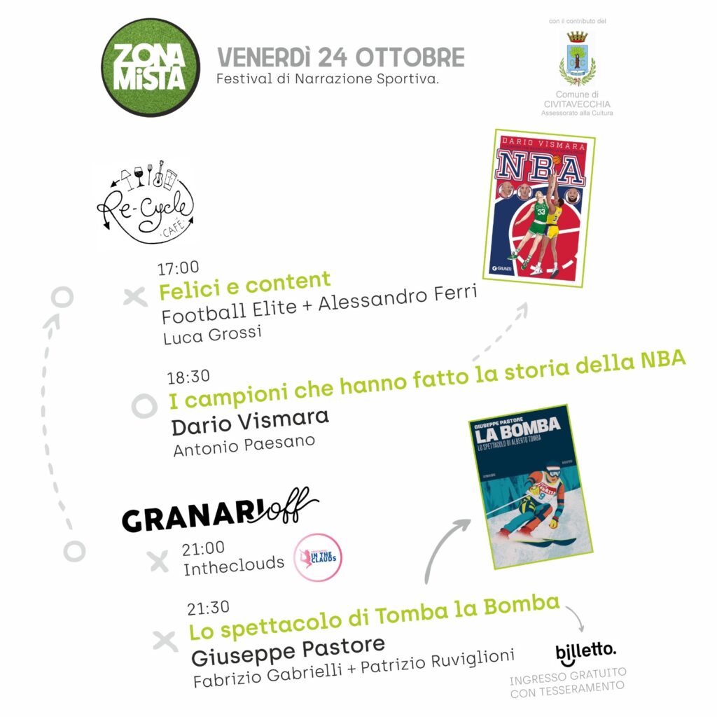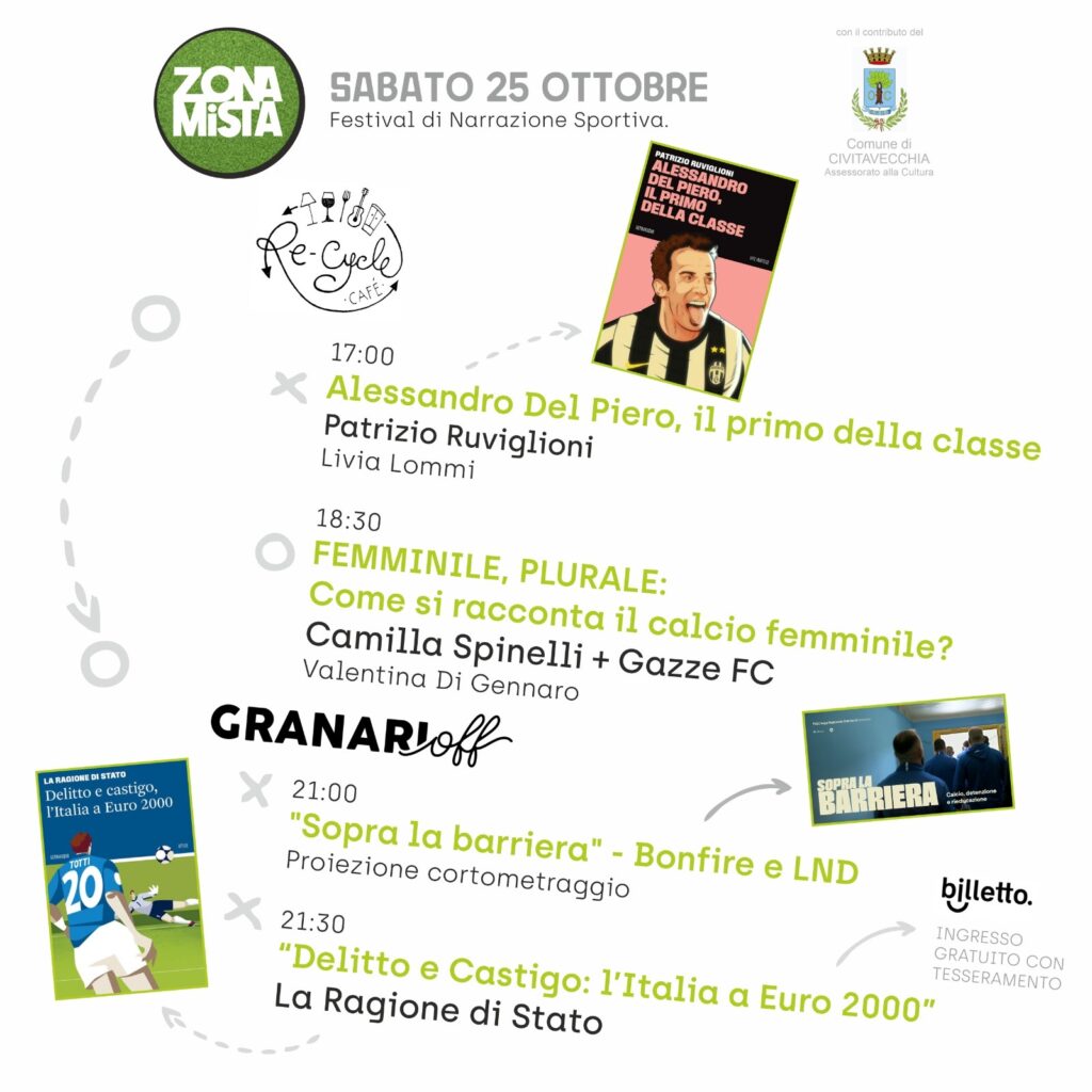 Fabrizio Gabrielli, curatore del festival (che ha coinvolto, oltre agli organizzatori del Granari Off, anche Re-Cycle Cafè e FORTE! Festival), racconta così l’iniziativa: i ragazzi del Granari Off hanno messo su un bel festival, anche grazie al supporto dell’Assessorato alla Cultura della Città di Civitavecchia: per tre giorni, a Civitavecchia arriveranno alcune tra le migliori voci del racconto di sport: ci saranno Emanuele Atturo, Sandro Bonvissuto, Giuseppe Pastore, La Ragione di Stato, Dario Vismara, Patrizio Ruviglioni, Gianni J Galleri, Giancarlo Liviano D’Arcangelo. Un programma, poi, per niente calciocentrico, che anzi darà spazio anche a visioni laterali e tematiche importanti, di inclusione, dello sport come volano salvifico.